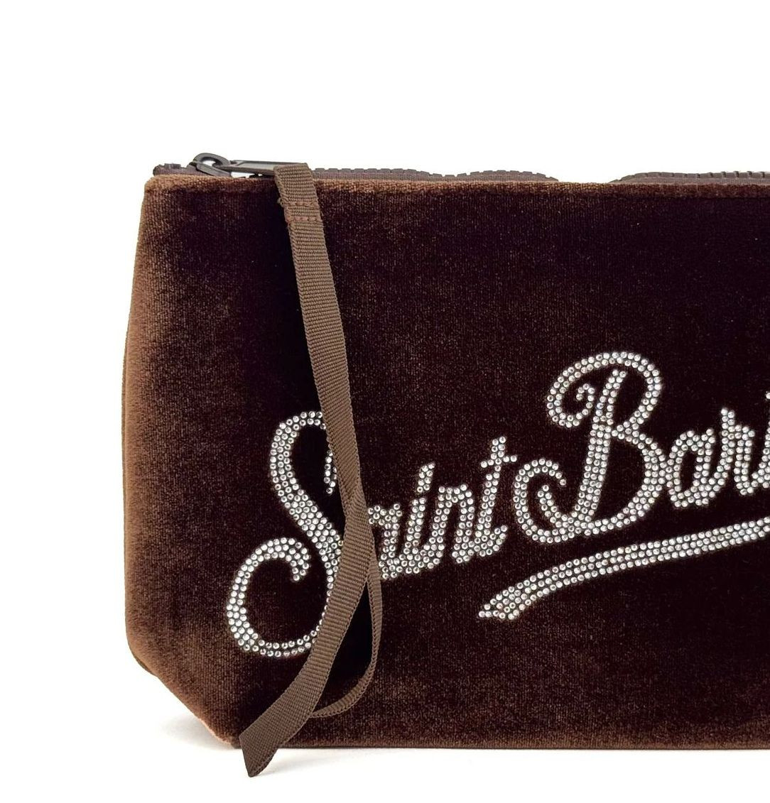 Elegante e luminosa: il caldo velluto cammello arricchito da dettagli in strass per un tocco di raffinatezza. Pochette realizzata in tessuto scuba e velluto, in un delicato tono cammello. Logo in strass e passante per il polso in gros-grain.