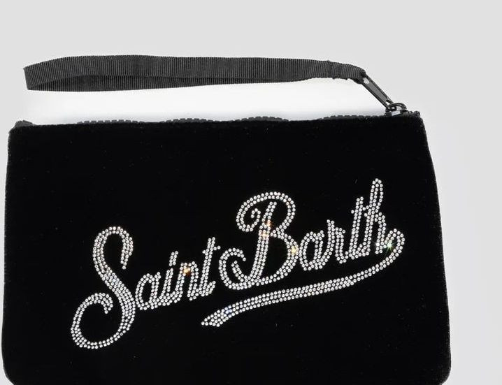 Pochette da donna Aline di MC2 Saint Barth, in velluto e arricchita da eleganti strass. Realizzata in ciniglia con un raffinato tessuto tinta unita, presenta il logo Saint Barth in strass. Dotata di chiusura con zip e passante per il polso.