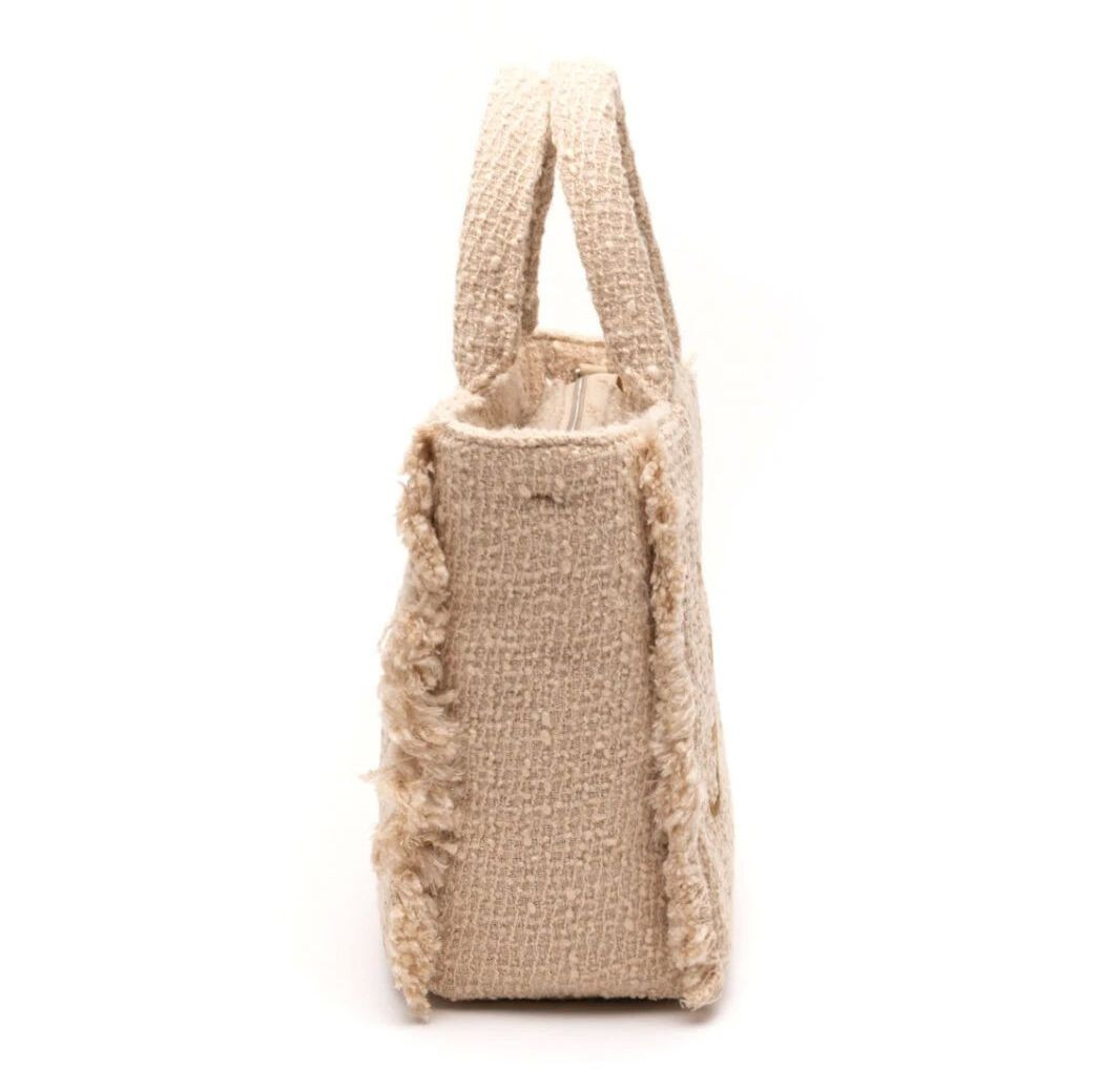 Un mix perfetto di tradizione e modernità, dove il tweed si fonde con linee contemporanee per un look raffinato e versatile. Questa borsa a mano in misto lana è l'accessorio ideale per chi cerca eleganza e praticità. La tracolla, regolabile e removibile, permette di adattarla facilmente a ogni esigenza. Realizzata in tessuto tweed di alta qualità, è arricchita da una tasca interna per organizzare al meglio i tuoi effetti personali. Il logo ricamato aggiunge un tocco di classe, rendendo questa borsa un must-have per ogni guardaroba.
