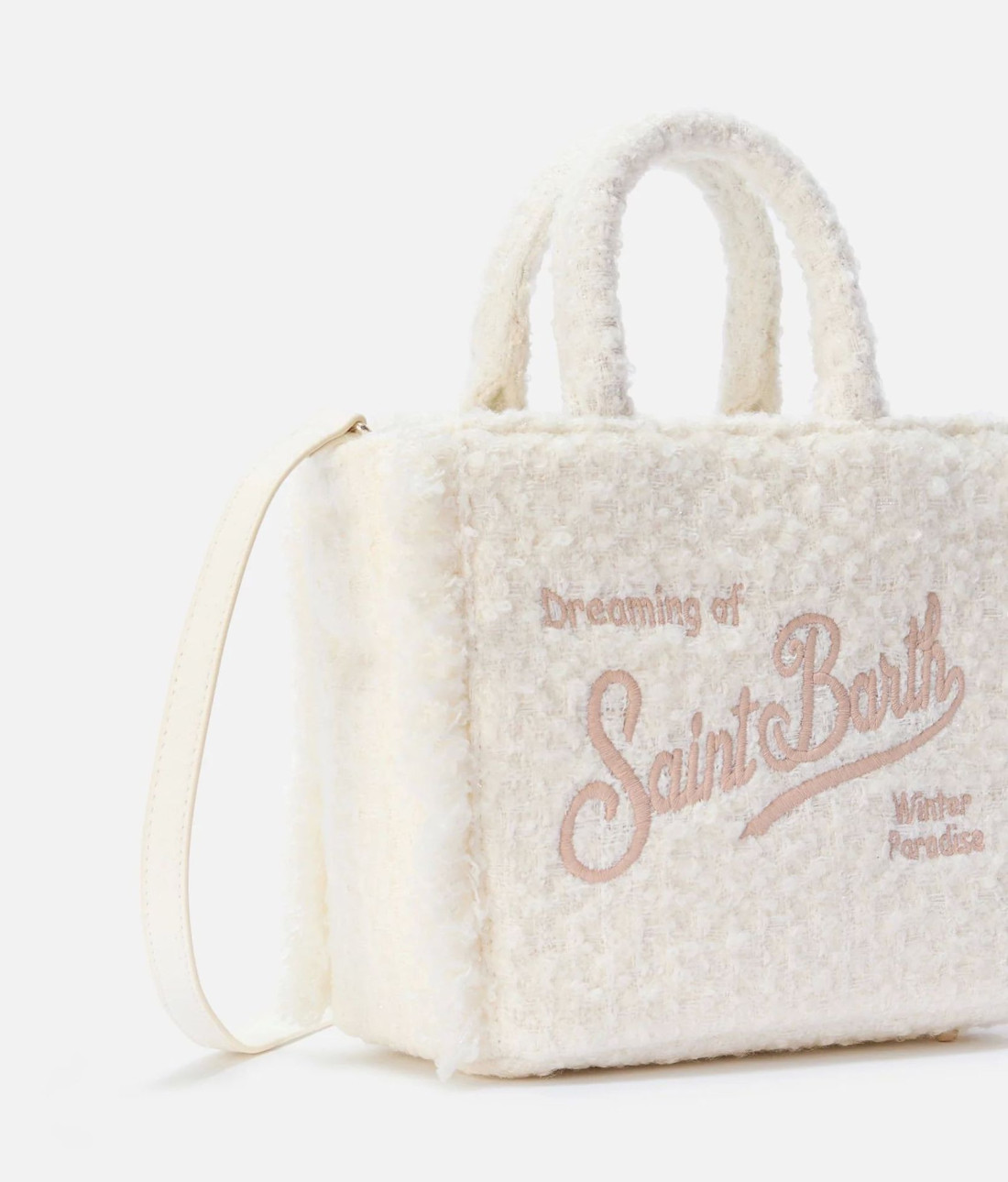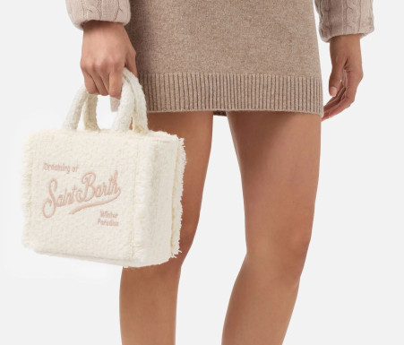 La Vanity Mini Tweed si distingue per uneleganza minimal e sofisticata, ideale per completare ogni outfit con stile. La borsa a mano è realizzata in tweed e faux suede, con manici in tessuto, tracolla regolabile e removibile, tasca interna, logo ricamato e dettaglio frange.