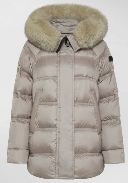 Puffer jacket ad ampie trapunte, in tessuto super-light in 100% poliestere riciclato.Di gusto urban sportswear, il modello ha una shape ad A modulabile grazie allapertura delle zip laterali. Cappuccio a collo alto con bordo in pelliccia di volpe regolabile, staccabile e con risvolto, tasche a filetto, chiusura con zip nascosta a doppio cursore, patta e bottoni.