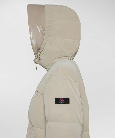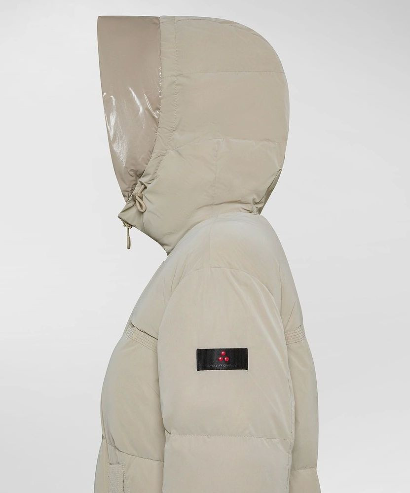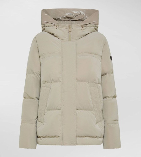 Piumino a trapunte larghe, realizzato con tessuto principale in tela di nylon spalmata, dall'effetto gommato e opaco, e tessuto secondario in nylon perlato. La combinazione dei materiali conferisce al capo una mano morbida, leggera e un aspetto pulito e dinamico. Cappuccio fisso regolabile e collo a cratere che avvolge dolcemente. Chiusura frontale con zip a doppio cursore e due ampie tasche laterali, entrambe coperte da patta. Imbottitura in piuma d’oca certificata EDFA. Un modello che unisce stile e funzionalità, perfetto per le giornate invernali e versatile anche per occasioni più formali grazie alle sue linee minimal. Confortevole e dalla vestibilità regular. Lunghezza media.