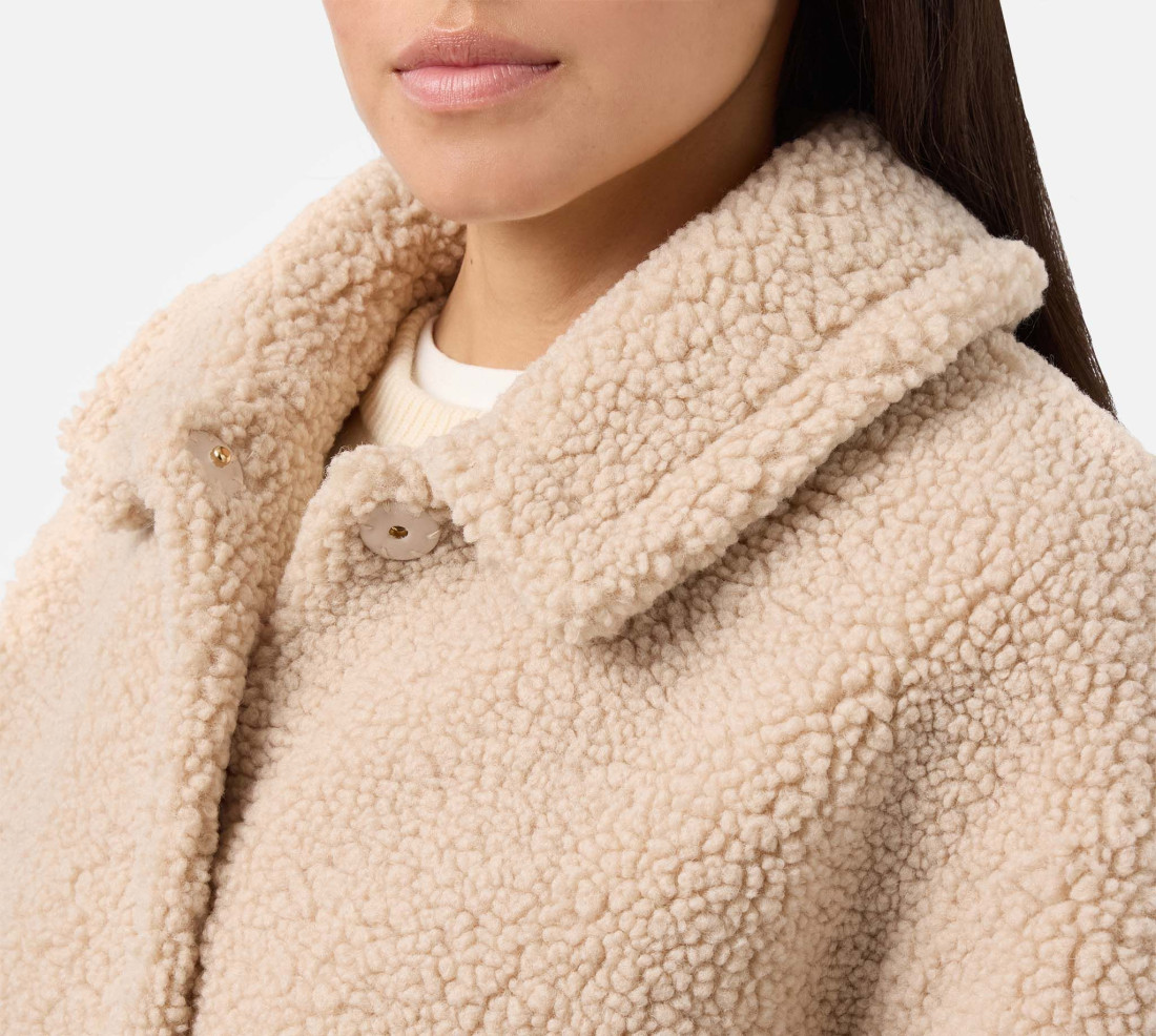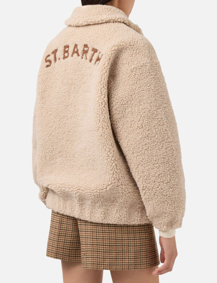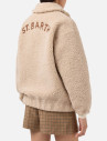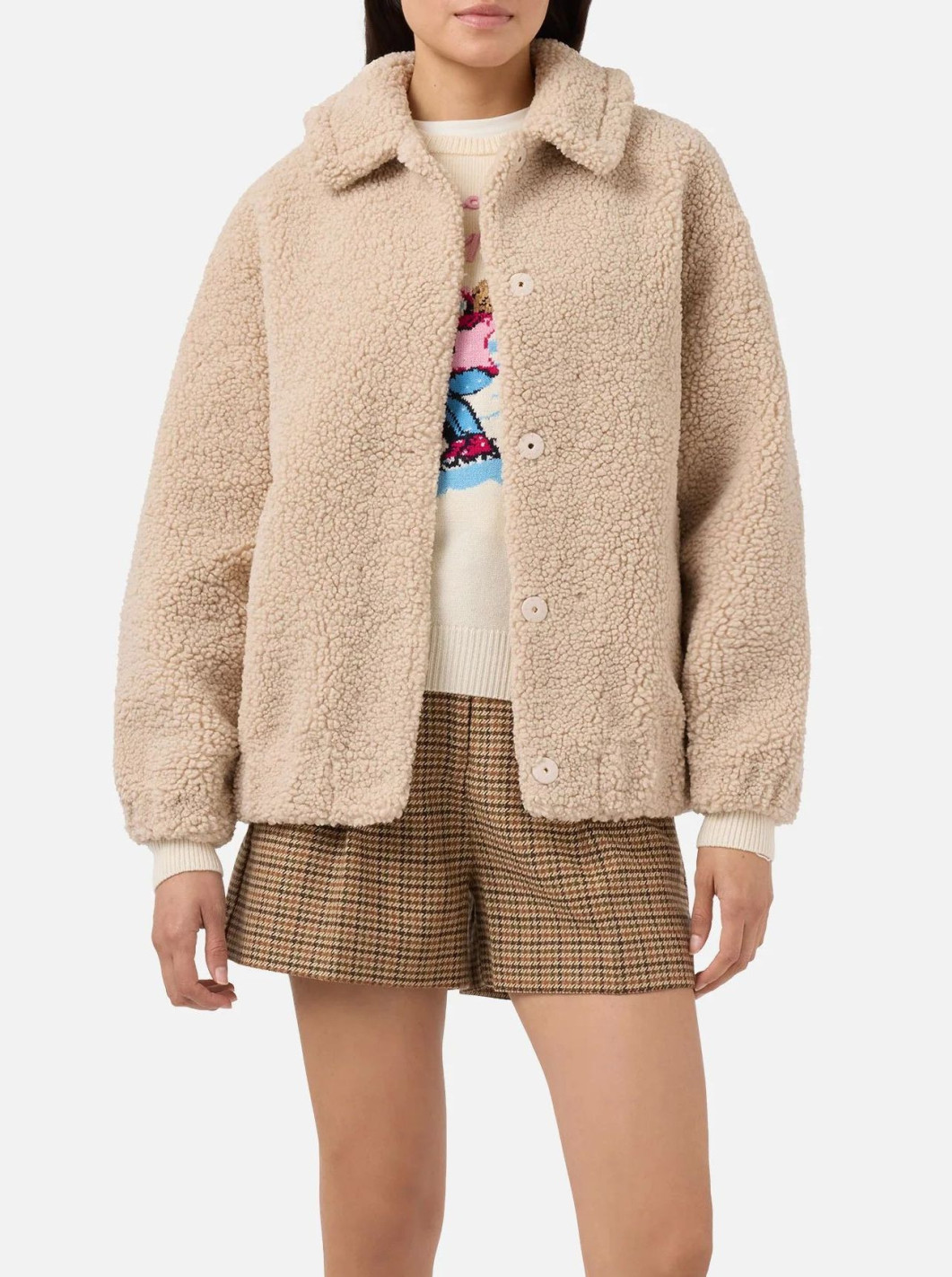Il teddy bomber Jeanne si caratterizza per un mood cozy-cool, con una vestibilità over e un collo camicia arrotondato, arricchito da una patch sul retro che ne esalta il design. La chiusura è a bottoni automatici, mentre le tasche, con filetto singolo e fodera calda, garantiscono comfort. I polsi e i bordi elasticizzati e arricciati completano il look, mentre la scritta patch sulla schiena aggiunge un tocco distintivo. La lunghezza arriva ai fianchi e la fodera è in poliestere, materiale che compone interamente il capo.
