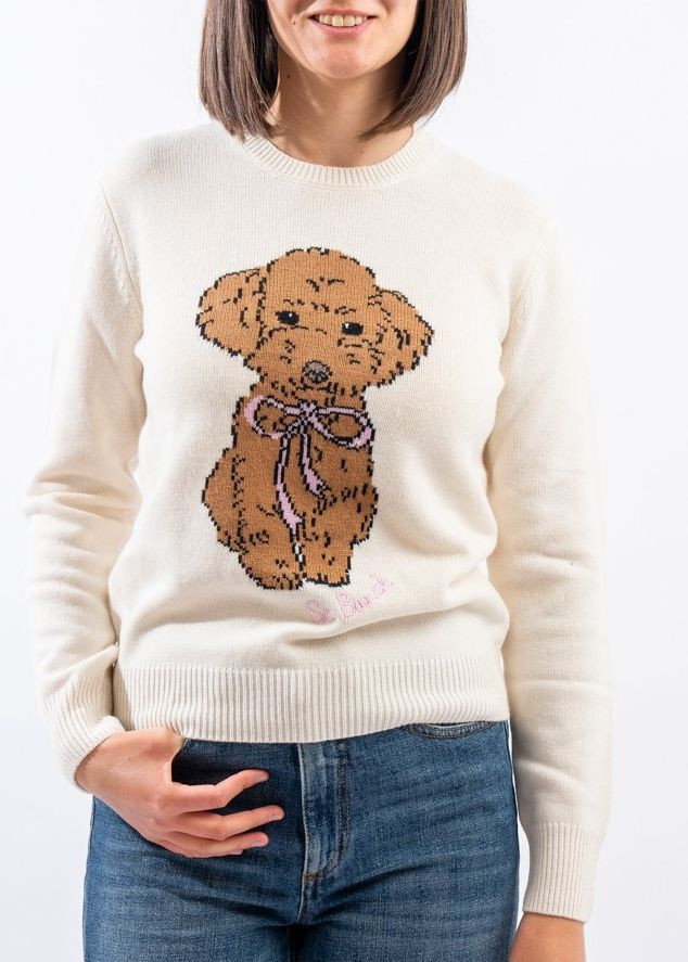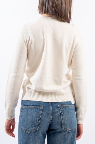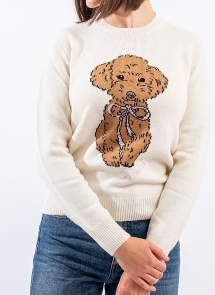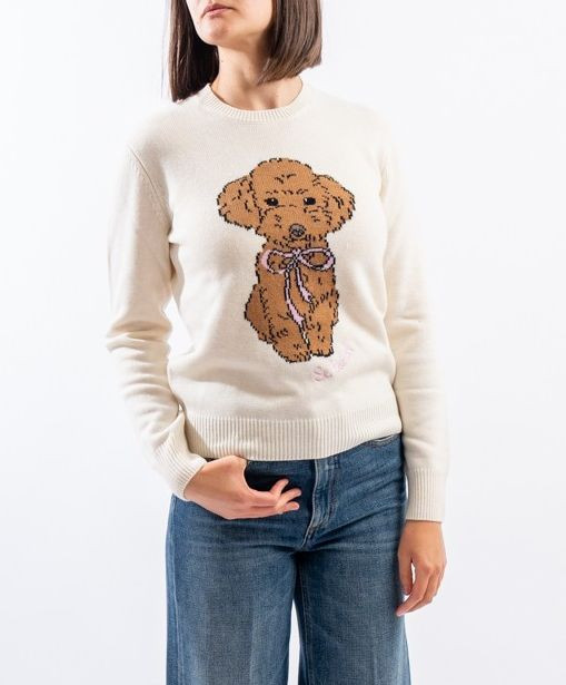 Un maglione in misto cashmere che unisce un tocco iconico e giocoso, caratterizzato da una maglia rasata e una finezza di 7 gg. Il modello presenta un girocollo, maniche lunghe e bordi a coste su fondo, collo e polsi, per una vestibilità regolare. La composizione del capo include il 40% di lana, il 10% di cashmere, il 30% di viscosa e il 20% di poliammide.