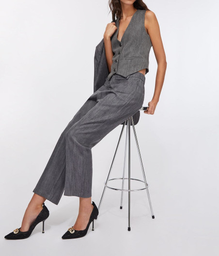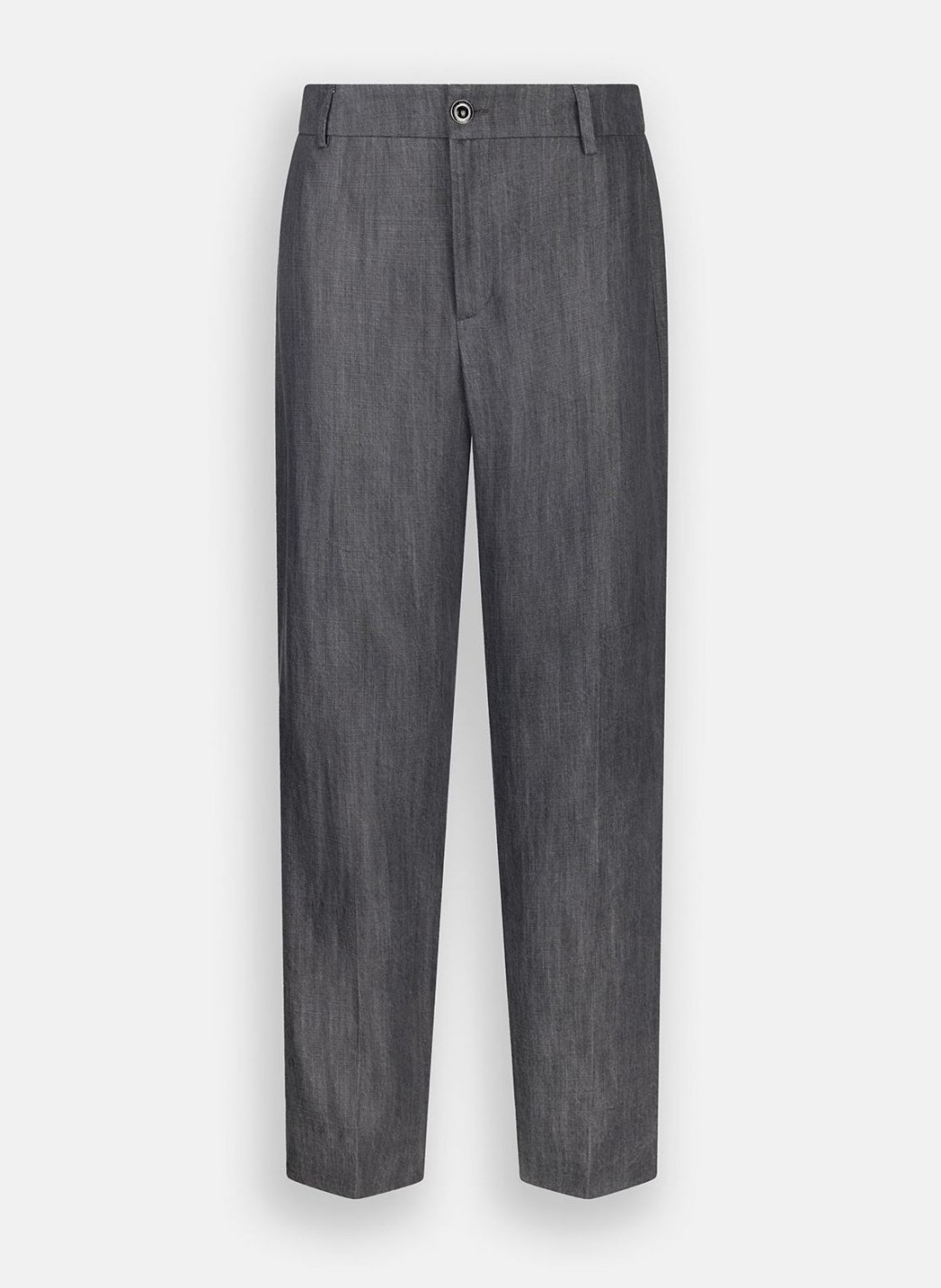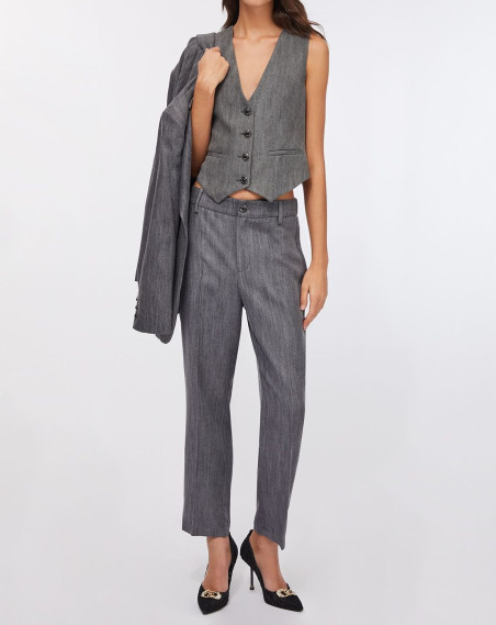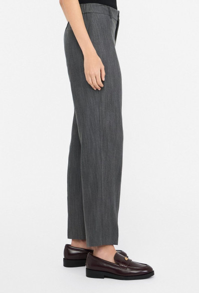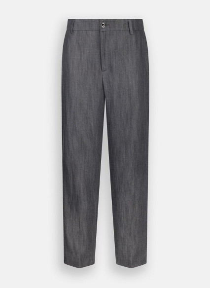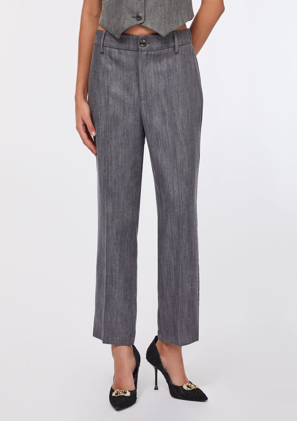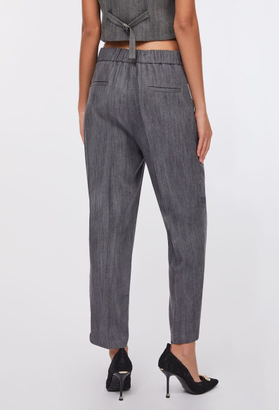Pantaloni in denim di lyocell con piega stirata, vita alta e gamba dritta. Presentano tasche a filetto sul retro e cintone elastico in vita sul retro. Chiusura con bottone e zip nascosta. Lunghezza gamba di 74 cm e larghezza fondo gamba di 21 cm. Composizione: tessuto principale 100% lyocell fodera principale 100% poliestere.